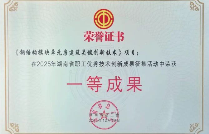 12月19日,2025年湖南省职工优秀创新成果交流发布活动在长沙举行,由湖南建投建工集团工会组织、技术创新研究院牵头申报的“钢结构模块单元房建筑关键创新技术”从全省145个参评项目中脱颖而出,成功斩获一等成果,代表着全省职工技术创新领域的最高水平。