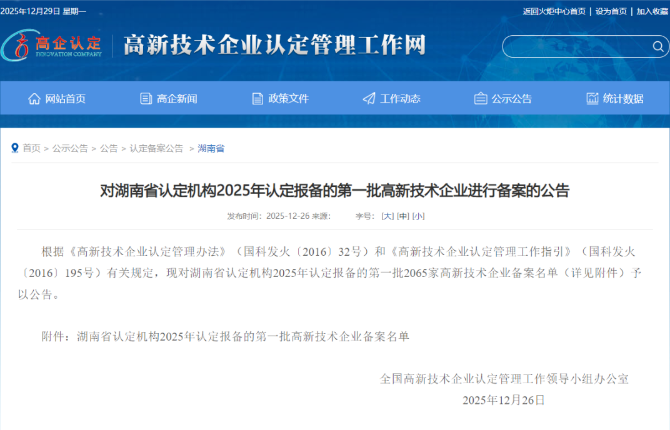 12月26日,全国高新技术企业认定管理工作领导小组办公室发布了关于对湖南省认定机构2025年认定的第一批高新技术企业进行备案的公告,湖南建投集团旗下湖南省城乡环境建设有限公司成功通过国家高新技术企业认定,成为国家高新技术企业,标志着该公司在资源与环境领域的研发水平和应用能力获得权威认可。此次获评,也是城乡环境公司积极响应国家加快经济社会发展全面绿色转型、建设美丽中国战略部署的具体实践。