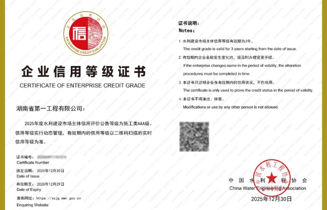 近日,中国水利工程协会公布2025年度水利建设市场主体信用评价结果,湖南建投一建获评水利建设市场主体信用评价施工类最高等级—AAA级。据悉,全国水利建设市场主体信用评价是我国水利行业最具权威性和公信力的综合评价体系,由水利部统一部署,中国水利工程协会组织实施。当前,水利建设市场主体信用评价结果已成为全国各省市水利工程建设市场准入、招标投标及评优评奖的重要依据。