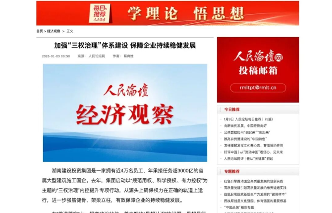 编者按:1月9日,人民日报社主管、中央主要新闻网站、中央重点理论网站《人民论坛》刊发中央党校厅局级干部进修班第95期学员、湖南建设投资集团党委书记、董事长蔡典维同志个人理论文章。加强“三权治理”体系建设保障企业持续稳健发展中央党校厅局级干部进修班第95期学员湖南建设投资集团党委书记、董事长 蔡典维湖南建设投资集团是一家拥有近4万名员工、年承接任务超3000亿的省属大型建筑施工国企。