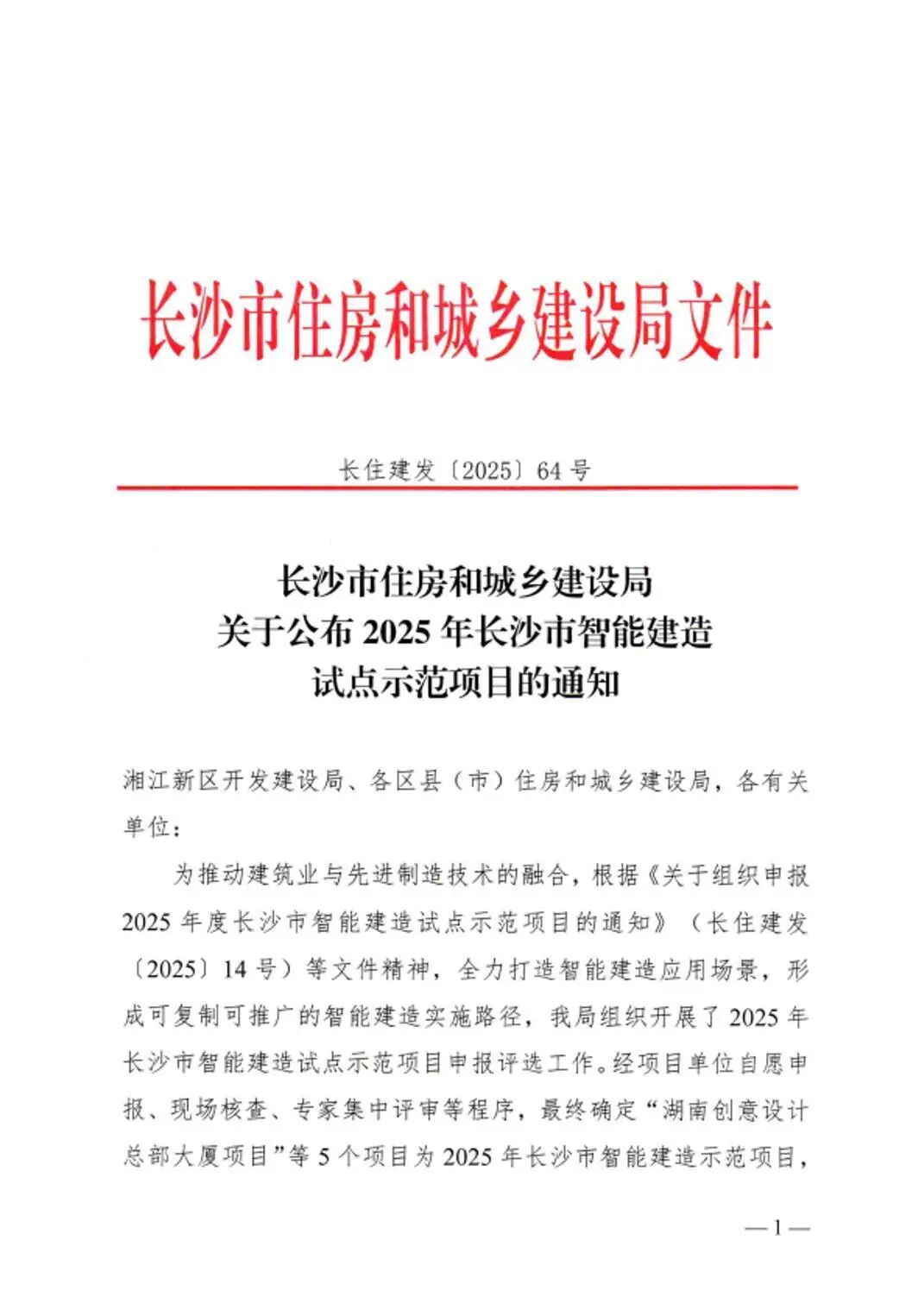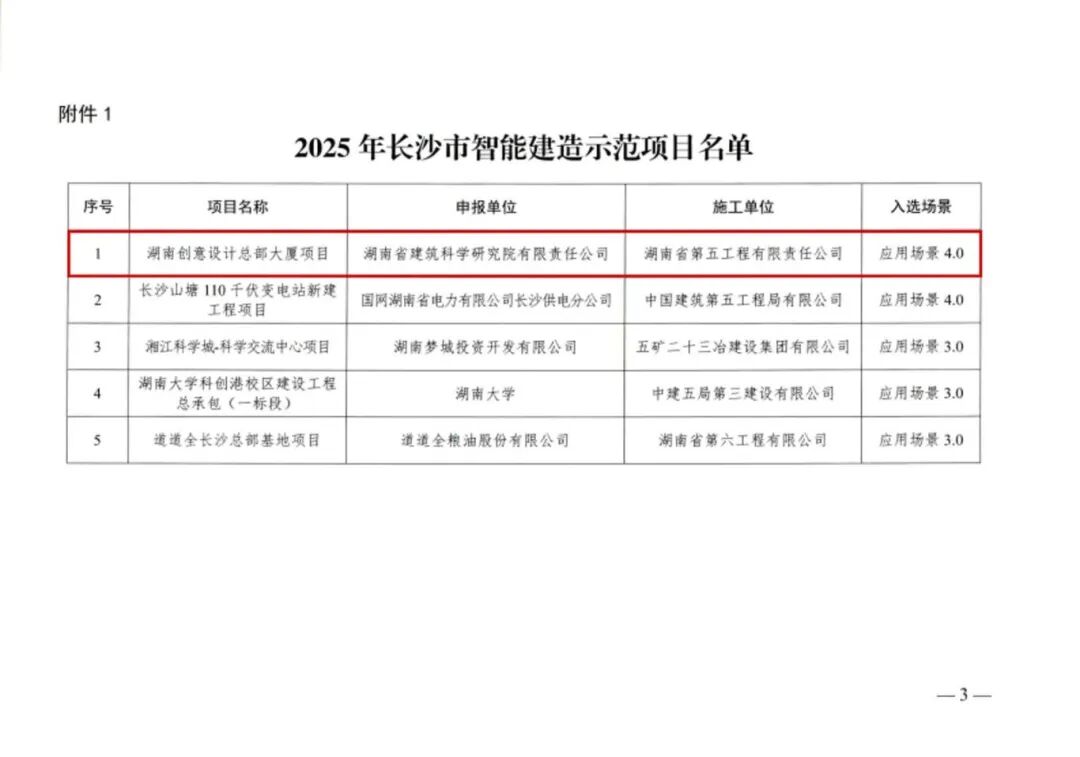 近日,长沙市住房和城乡建设局正式公布2025年度智能建造试点示范项目名单。由湖南建投集团旗下湖南省建筑科学研究院有限责任公司全过程主导申报并承担核心技术应用的“湖南创意设计总部大厦项目”,凭借前瞻性的智慧建造与运维理念,成功入选长沙市智能建造应用场景4.0示范项目。这不仅是一份荣誉,更是省建科院在“智能建造+智慧运维”一体化实践中的实力印证。