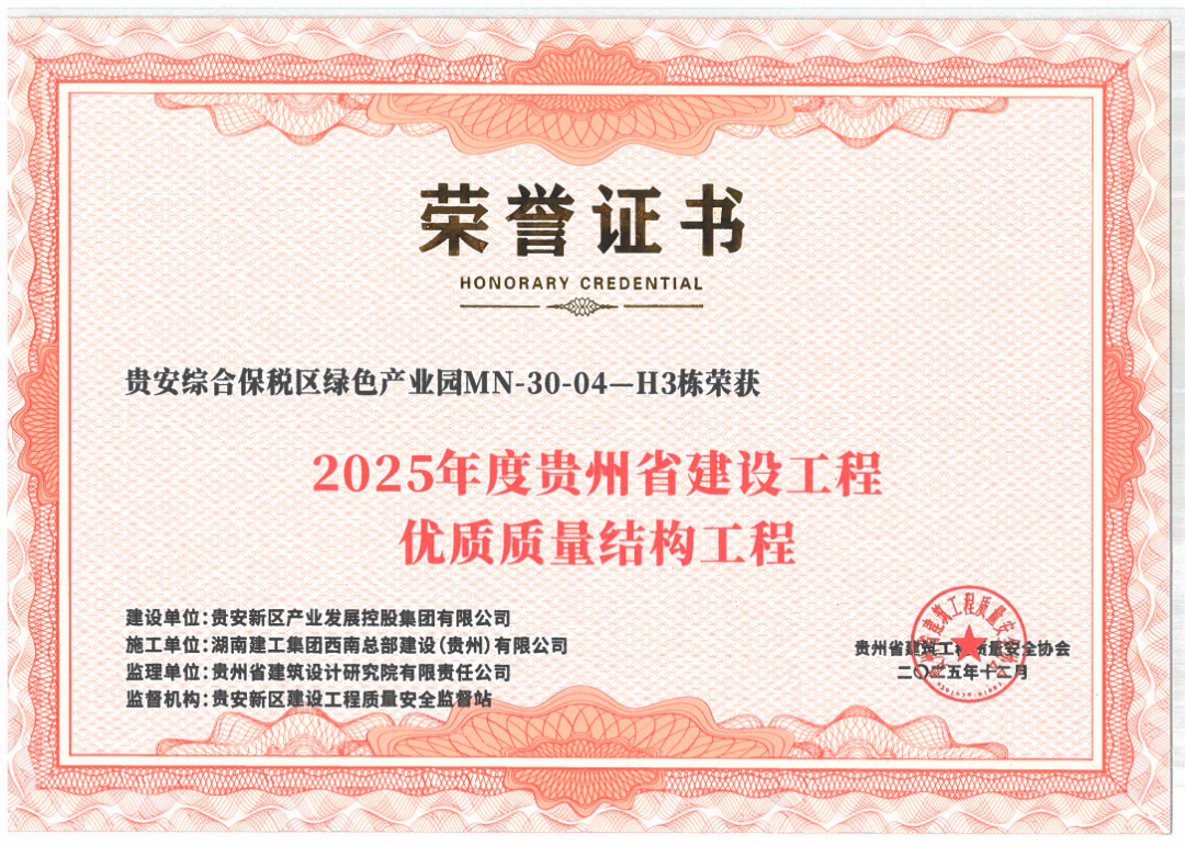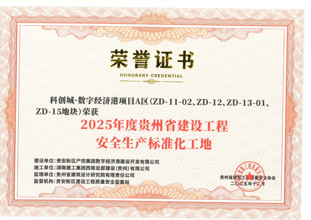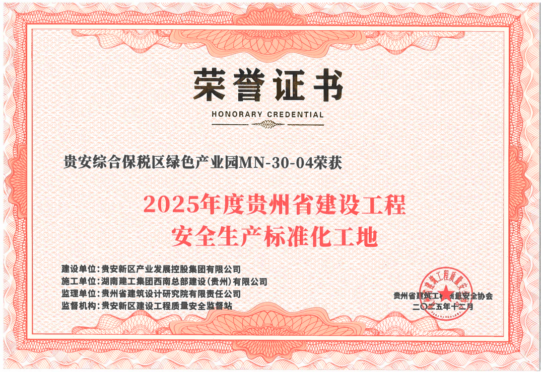 近日,2025年度贵州省建设工程荣誉榜单公布,由湖南建投西南建设承建的“科创城・数字经济港A区项目”与“贵安综合保税区绿色产业园MN-30-04地块项目”凭借出色的安全质量管理成效,双双荣获“安全生产标准化工地”与“优质质量结构工程”两项省级大奖。这不仅是项目管理和技术水平的体现,更是西南建设坚持党建引领、推动党建与生产经营深度融合的生动实践。