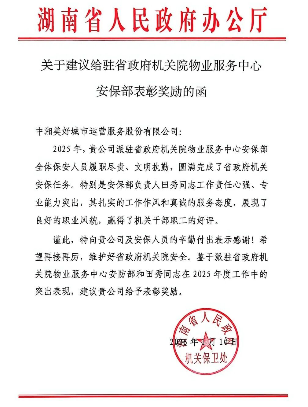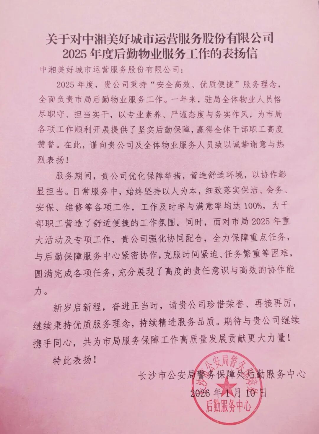 服务及时率与满意度均达100%。长沙市公安局警务保障处后勤服务中心对公司驻局物业团队在2025年度的后勤服务工作给予了充分肯定与高度评价。过去一年,长沙市公安局物业服务项目,在会务、安保、工程、保洁等日常工作中细致入微,全年服务及时率与满意度均达100%。面对重大活动与专项任务,团队更是迎难而上,与警保处紧密协作,圆满完成了各项保障工作,用专业和担当赢得了甲方的认可。