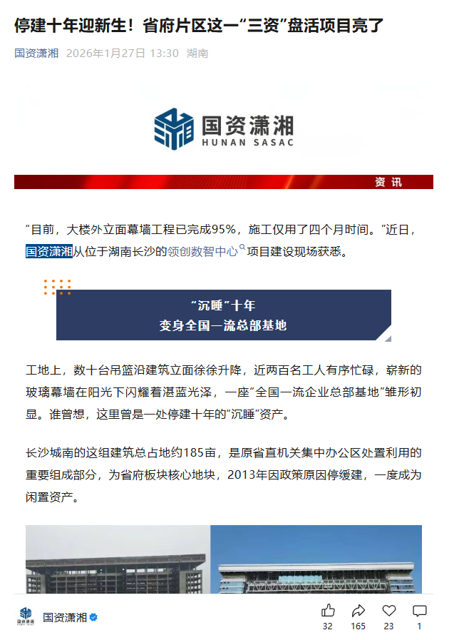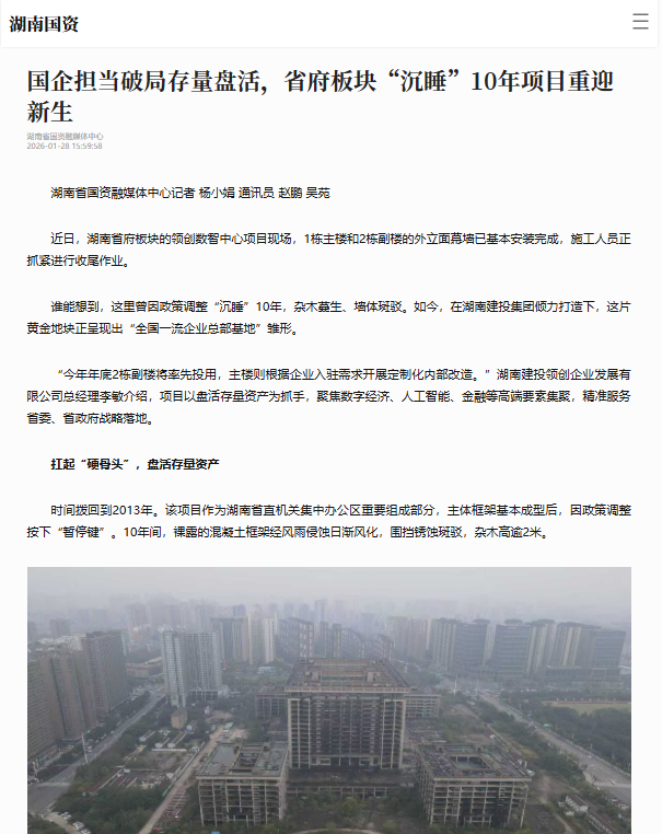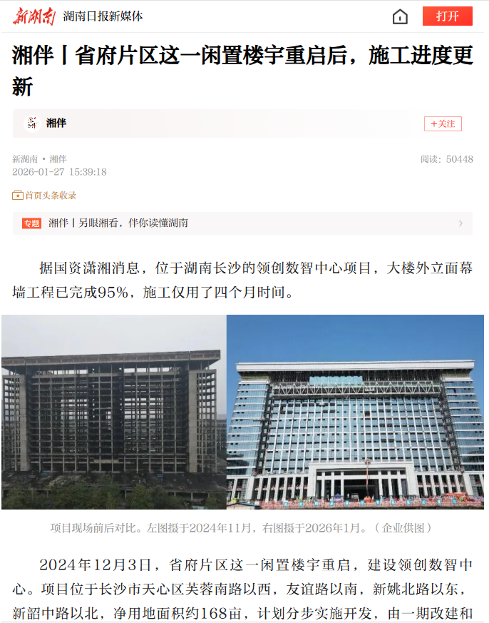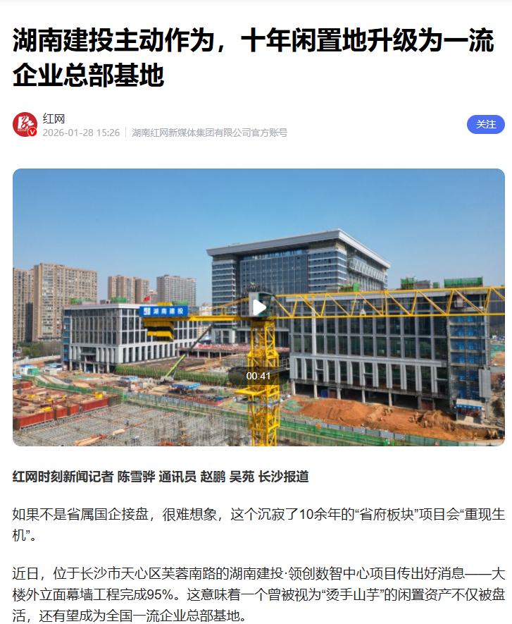 近日,湖南建投领创数智中心项目因其在“三资”盘活、城市更新与产城融合方面的突出成效,获得湖南日报、湖南卫视、红网、湖南经视、湖南国资、国资潇湘、长沙晚报、掌上长沙等众多省内外媒体集中报道,充分彰显了集团在服务省级战略、推动区域高质量发展中的国企担当。