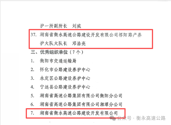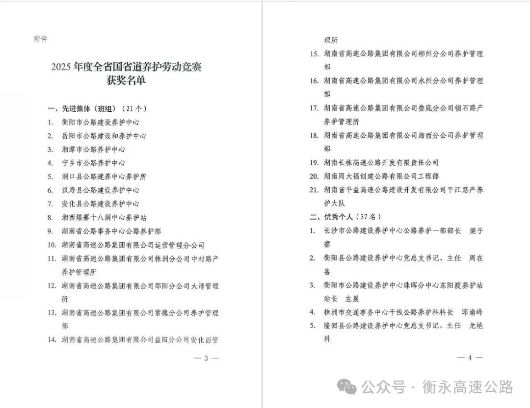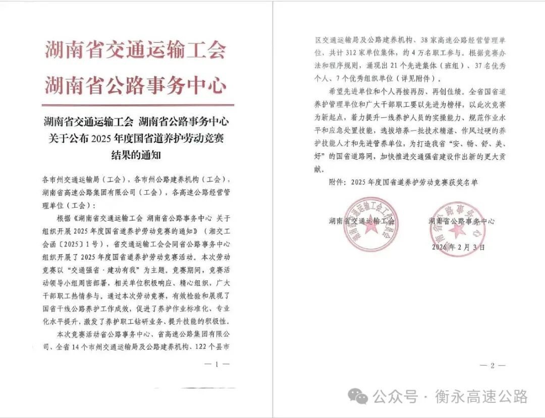 近日,由省交通运输工会、省公路事务中心联合组织的2025年度国省道养护劳动竞赛评选结果出炉,湖南建投衡永高速在高速公路组中荣获优秀组织单位和1名优秀个人2项荣誉。