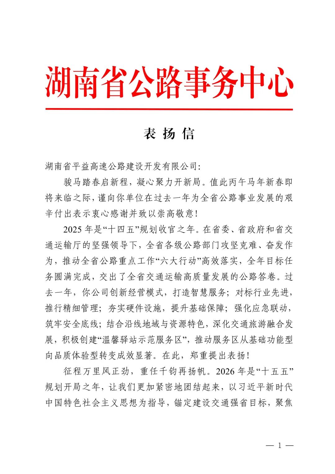 近日,湖南建投平益高速接连收到湖南省公路事务中心的表扬信与湖南省公安厅交通管理总队高速交管五支队的感谢信,既是对平益高速 2025 年全方位工作的高度褒奖,更是对其践行国企责任、守护公众出行的有力印证。