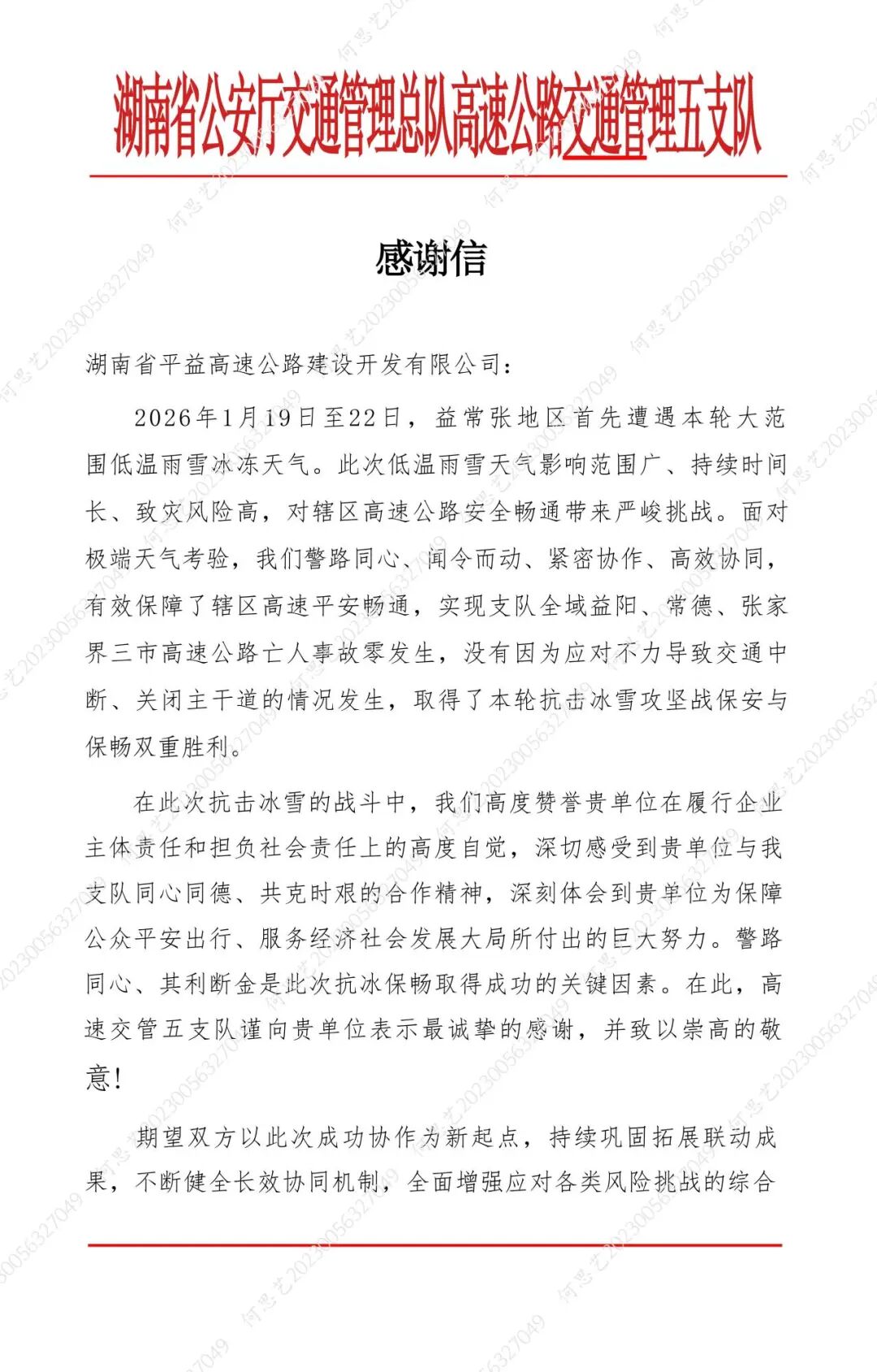 长期并肩作战的湖南省公安厅交通管理总队高速交管五支队在感谢信中指出,2026 年1 月19日至22日,益常张地区遭遇大范围低温雨雪冰冻天气,影响范围广、持续时间长、致灾风险高,给高速公路安全畅通带来严峻挑战。