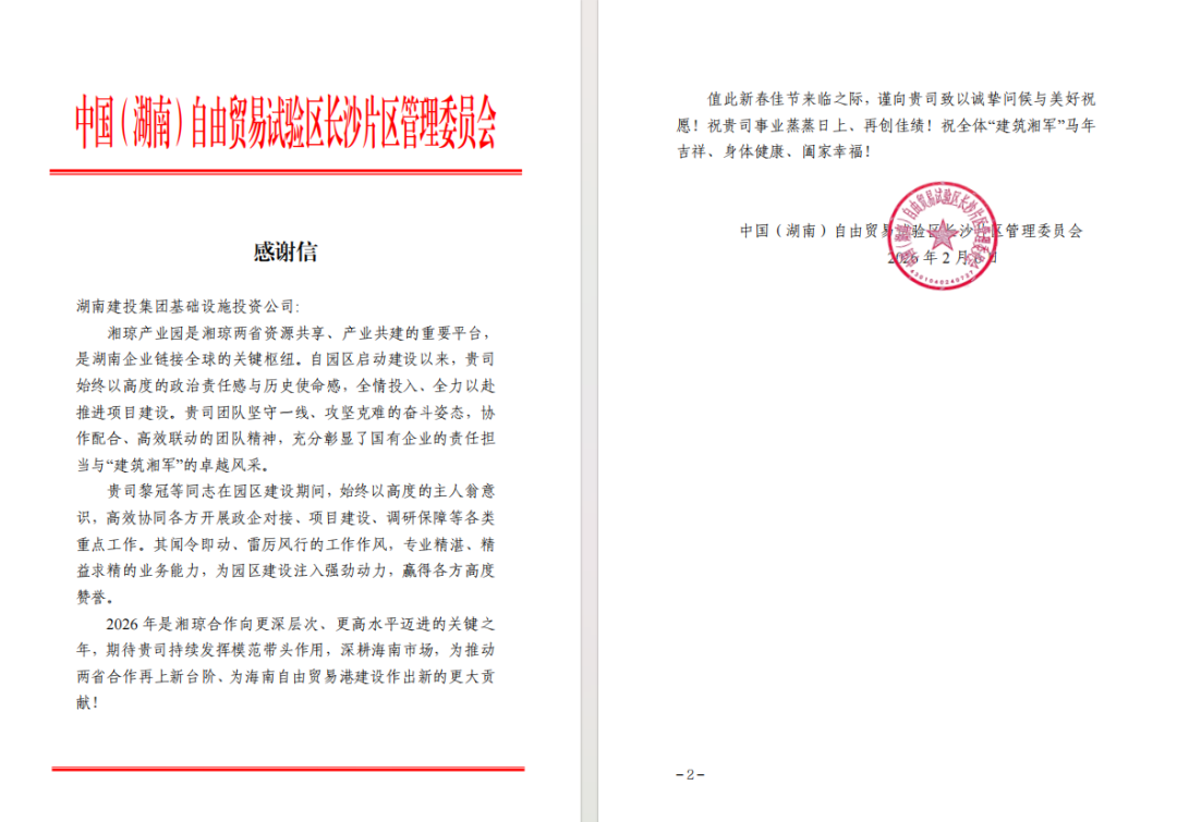 项目公司的专业管理能力与实干实绩获得中国(湖南)自由贸易试验区长沙片区管理委员会高度肯定,特发来感谢信,对其在跨省合作中的责任担当、高效执行力予以重点赞扬,彰显了项目公司在服务国家战略、推动跨省区域合作中的国企管理实力。