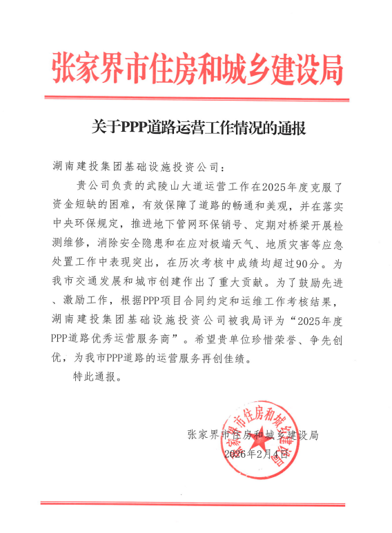 凭借扎实的运营管理成效,项目在历次政府绩效考核中均取得90分以上的优异成绩,基础投也成功斩获张家界市住建局颁发的“2025年度PPP道路优秀运营服务商”称号,这一荣誉是对项目公司PPP道路运营管理能力的高度认可。