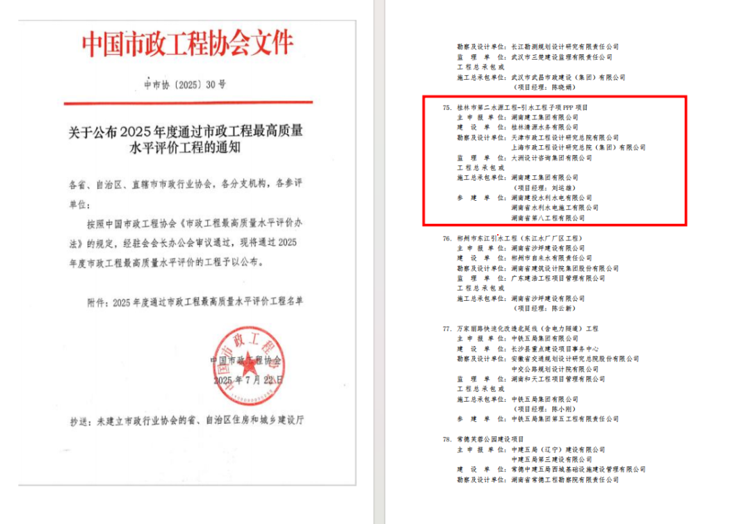 凭借专业的项目管理能力与过硬的工程建设成果,该项目不仅成功斩获2025年广西真武阁优质建设工程(自治区级优质建设工程),更顺利通过2025年度市政工程最高质量水平评价,实现自治区级与国家级质量荣誉双丰收。此次双奖加身,是对项目公司 PPP 项目管理能力的充分印证,也为同类水利引水 PPP 项目建设树立了优质标杆。