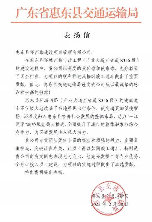 项目的优质建设与投用成效,获得惠东县交通运输局高度认可,特发来表扬信,对项目公司的突出贡献及向有文同志的专业管理表现予以重点表扬,这份肯定是对项目公司市政工程建设管理能力的有力彰显。