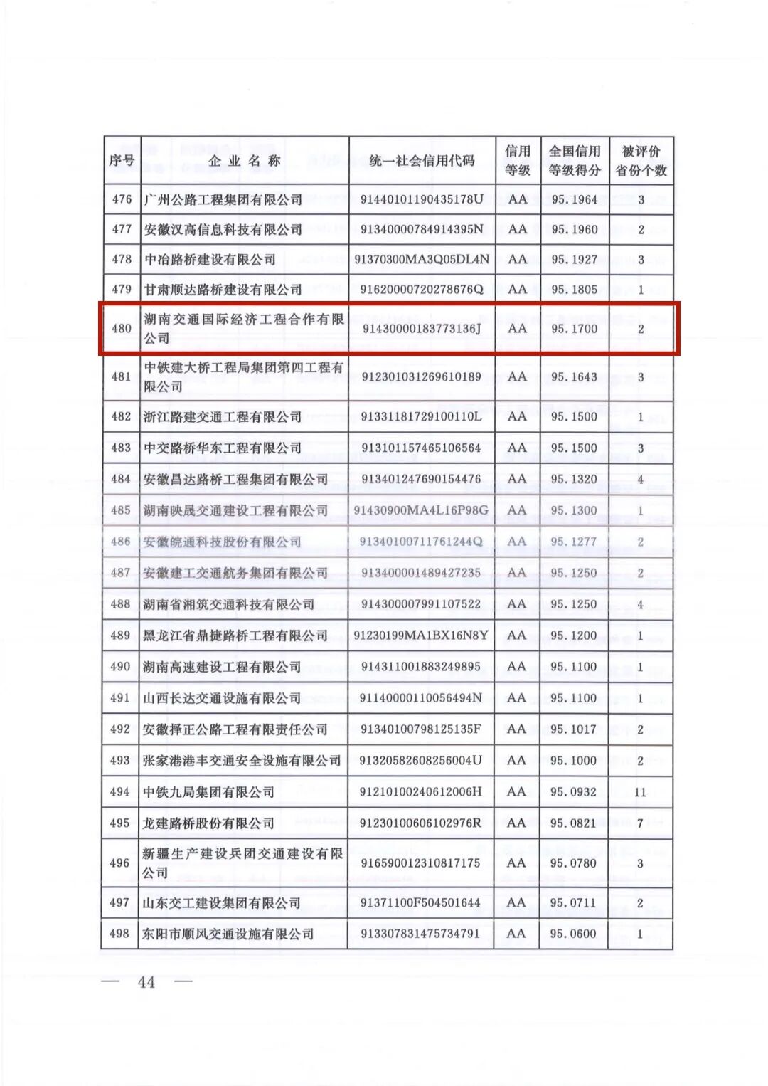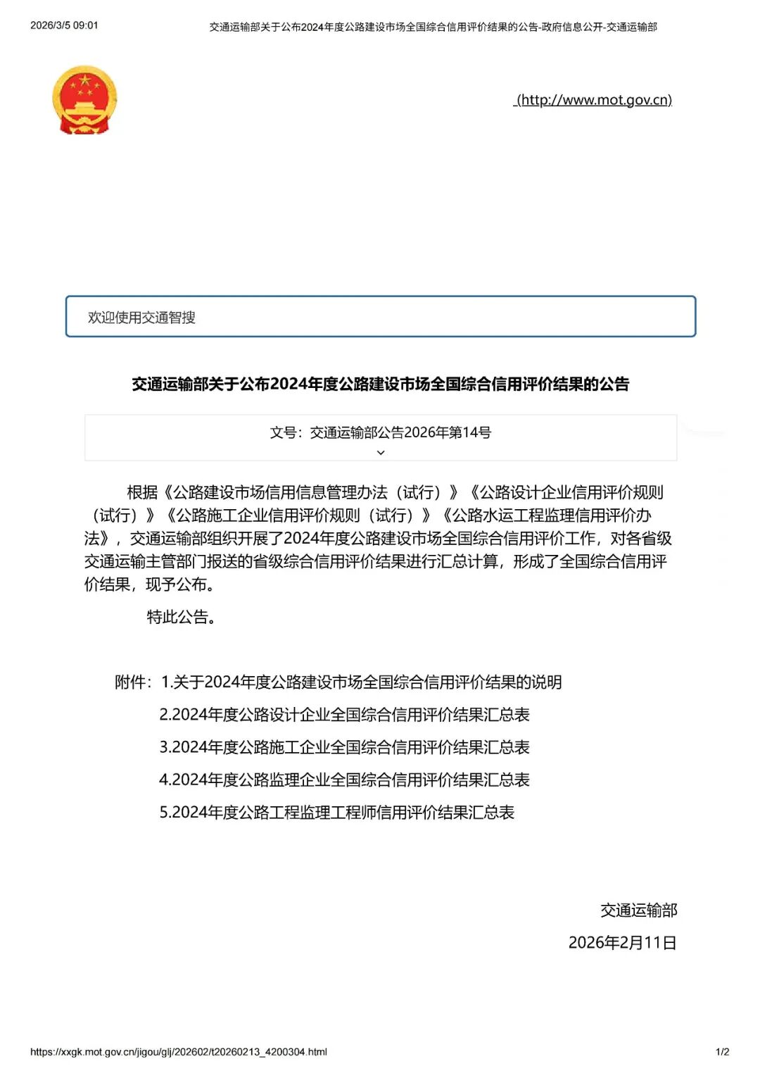 近日,交通运输部官网公布《关于2024年度公路建设市场全国综合信用评价结果的公告》(交通运输部公告2026年第14号),湖南建投集团旗下湖南交通国际经济工程合作有限公司(以下简称“交通国合”)凭借优质的工程履约能力、规范的经营管理和良好的企业信誉,再次荣获2024年度公路施工企业全国综合信用评价“AA”级,充分彰显了其在全国公路工程建设领域的持续综合实力和良好社会形象,标志着交通国合信用建设持续稳居全国先进行列。