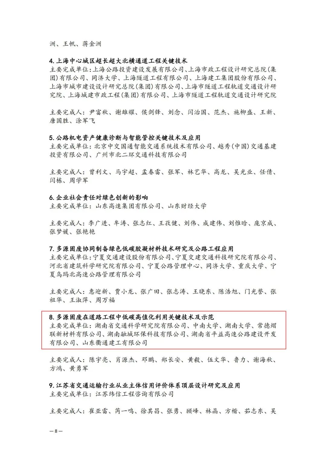 该两项科研成果由湖南建投平益高速、交通科研院、湖南交勘院、中南大学、湖南大学等单位共同申报获得。“高速公路数智服务成套技术研究与应用” 主要实现了主动交通管控技术、二维码报警技术、综合运营管理平台和智慧服务区四项关键技术的创新。“多源固废在道路工程中低碳高值化利用关键技术及示范”通过开发出一系列绿色低碳道路用再生建材,实现经济效益和社会环境效益双提升。