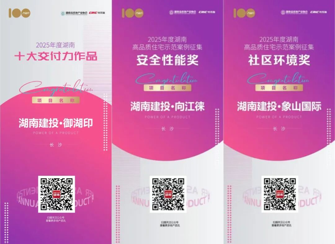 近日,在湖南省房地产业协会指导的“2025年度高品质住宅示范案例征集暨产品力测评”中,湖南建投地产集团所属三项目凭借卓越品质集体登榜:湖南建投·御湖印荣获“2025年湖南十大交付力作品”,湖南建投·向江徕摘得“安全性能奖”,湖南建投·象山国际斩获“社区环境奖”。三盘联袂获奖,充分彰显了湖南建投地产集团在住宅开发领域的硬核实力与品质追求。