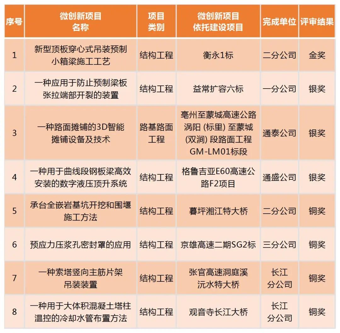 三项银奖项目分别聚焦于路面3D智能摊铺设备应用、预制梁板张拉装置优化、梁板安装设备自动化升级等领域,均取得重要技术突破;四项铜奖项目则围绕桥梁围堰施工、智能压浆技术、索塔主筋部榀吊装工艺及大体积混凝土温控等场景,实现了具有实践价值的创新应用。这些成果均来源于一线实际需求,兼具实用性与推广意义,生动践行了集团“以创新驱动发展”的核心理念。