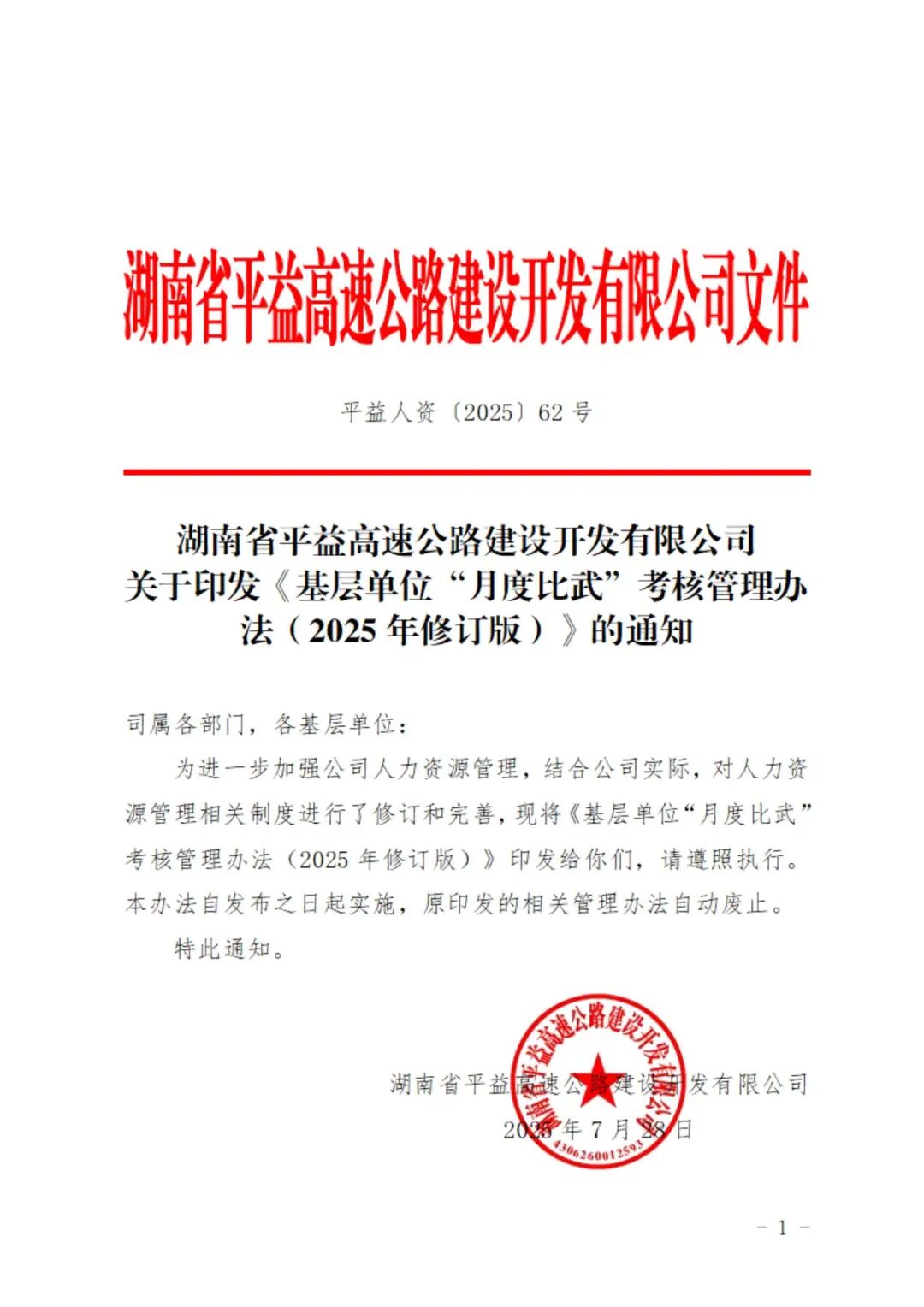 2023年,公司精准锚定部门管理、基层执行、关键岗位三大维度的核心职责,陆续出台《平益高速绩效考核管理办法》《基层单位“月度比武”考核管理办法》《“一把手”管理办法》三大核心制度,构建起“顶层设计—中层执行—基层落地”的制度闭环。