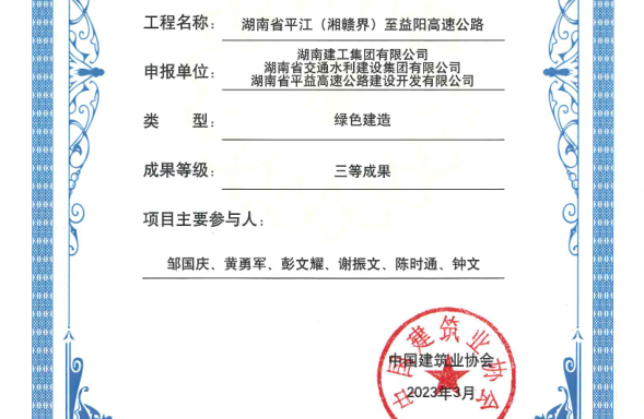 在绿色发展与数字转型的浪潮中,平益高速始终站在行业前沿,以技术创新斩获多项殊荣。绿色建造领域,2023年项目荣获中国建筑业协会“建设工程项目绿色建造竞赛三等成果”,后续“多源固废在道路工程中低碳高值化利用关键技术及示范”再获“茅以升科学技术奖——交通运输科学技术奖”二等奖,实现环保与效益的双赢。