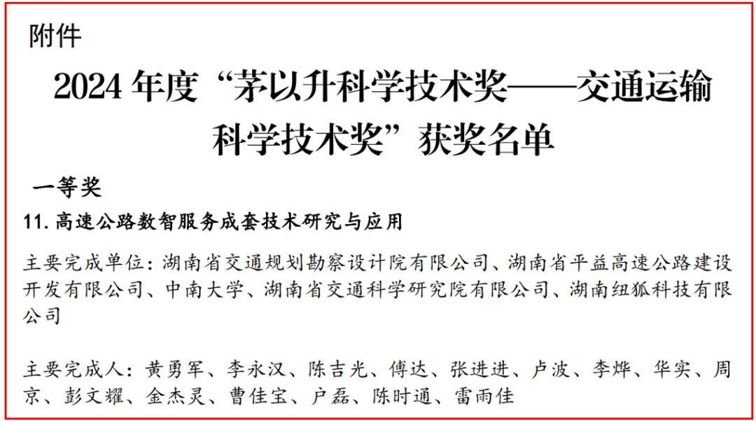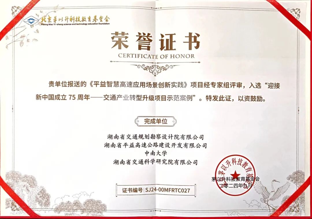 智慧升级成果更为亮眼。2024年,“平益智慧高速综合运营管理平台”和“'码上 OK'二维码互联网报警平台”入选“湖南交通运输数字化应用场景典型案例”;《平益智慧高速应用场景创新实践》获茅以升科技教育基金会“交通产业转型升级项目示范案例”银奖。2025年,“高速公路数智服务成套技术研究与应用”更是斩获“茅以升科学技术奖——交通运输科学技术奖”一等奖,标志着项目在数智化领域达到国内领先水平。此外,《科技引领,智建平益,匠心打造平安百年品质工程》还被评为“2023年建设工程项目管理最佳案例”,为行业提供了可复制的管理经验。