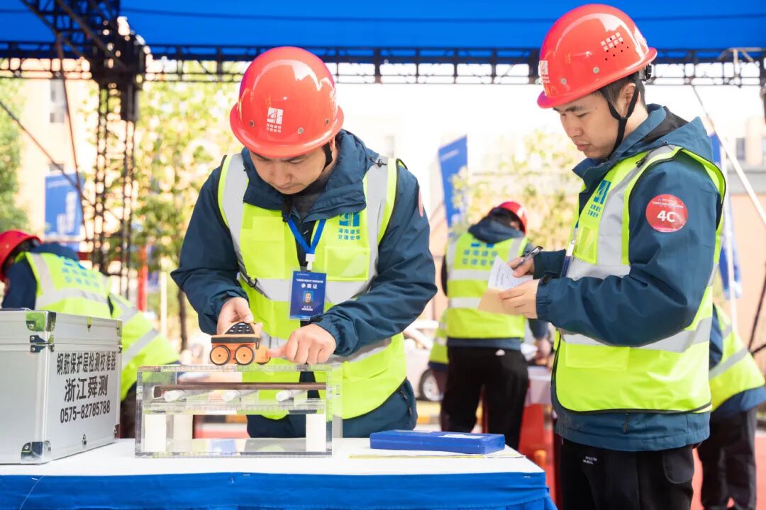 实操考核环节则在于检验选手能否将理论知识精准、规范地转化为动手能力,并在模拟的工作场景中,稳定、高效地完成检测任务,出具可靠数据。在“细集料筛分”赛场,选手们手法熟练、目光专注,从称量、振筛到计算,每一步都力求精准,体现出从源头把控质量的严谨态度。而在“钢筋保护层厚度及钢筋间距试验”检测现场,选手们手持专业仪器,如同进行“工程诊断”,通过细微信号捕捉钢筋排布与保护层厚度,确保工程“骨骼”健康安全。