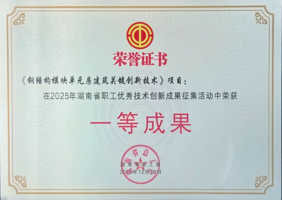12月19日,2025年湖南省职工优秀创新成果交流发布活动在长沙举行,由湖南建投建工集团工会组织、技术创新研究院牵头申报的“钢结构模块单元房建筑关键创新技术”从全省145个参评项目中脱颖而出,成功斩获一等成果,代表着全省职工技术创新领域的最高水平。